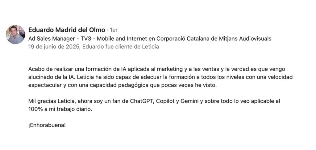 El mayor reconocimiento a mi trabajo es el éxito de los profesionales y las empresas que han confiado en mí. Estos testimonios no hablan de mí, sino de los resultados que han conseguido: procesos optimizados, horas de trabajo recuperadas y una nueva capacidad para innovar y competir.